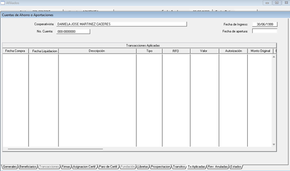 · Visualizar transacciones aplicadas: Esta sección es solamente de consulta, y aquí se podrá visualizar cuáles han sido las transacciones aplicadas en una determinada cuenta. Al ingresar a la pestaña de “Tx aplicadas” aparecerá la siguiente pantalla: