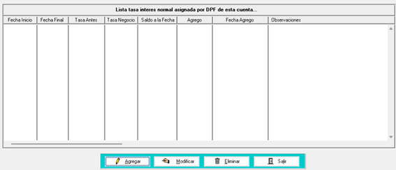 sirve para agregar, modificar o eliminar una tasa preferencial que se vaya a aplicar en esta cuenta. Al ingresar, se muestra la siguiente pantalla: