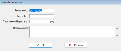Al entrar a esta ventana, deberá ingresar los datos solicitados, fecha inicio (desde cuando se aplicará la tasa), fecha fin (hasta cuando se aplicará la tasa), tasa de interés negociada y observaciones. Para guardar, presionar el botón “OK”.