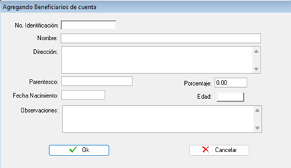En esta ventana deberá ingresar el número de identificación del beneficiario (Número de identidad), y presionar la tecla TAB en su teclado, al hacerlo, el sistema completará automáticamente la información de nombre, fecha de nacimiento y edad. Luego deberá ingresar la dirección, el parentesco, el porcentaje del beneficio y una observación. Para guardar, presionar en el botón “OK”.