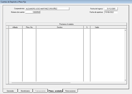 · Visualizar préstamos avalados por el afiliado: Para visualizar los préstamos avalados por el afiliado, deberá ir a la ventana principal de depósito a plazo fijo y seleccionar la viñeta de “Ptmos. avalados”, tal como se muestra a continuación: