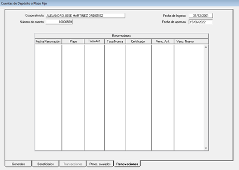 · Visualizar renovaciones de la cuenta: Para visualizar renovaciones de la cuenta, deberá ir a la ventana principal de depósito a plazo fijo y seleccionar la viñeta de “Renovaciones”, tal como se muestra a continuación: