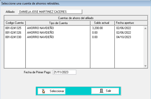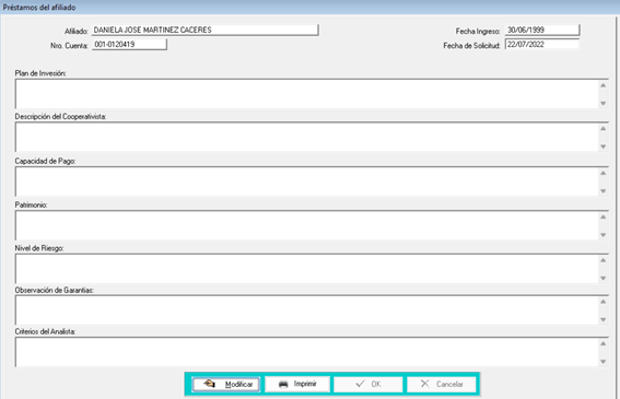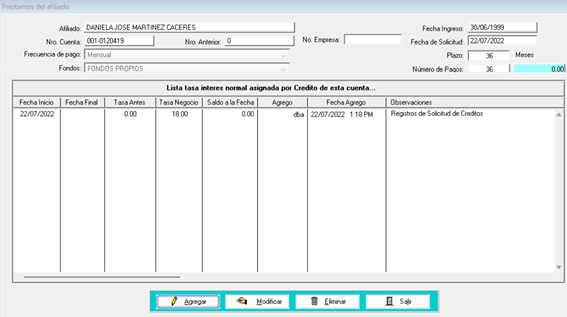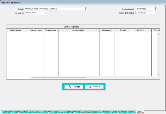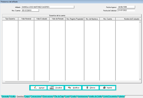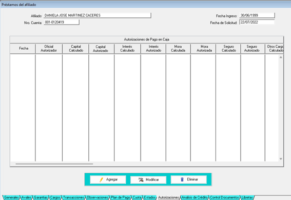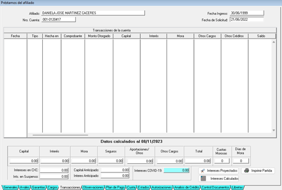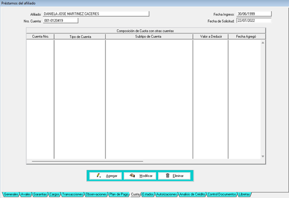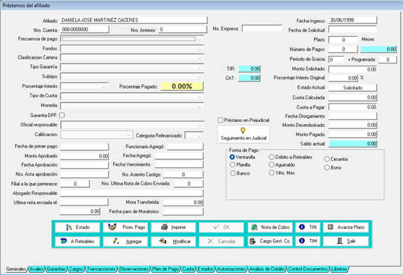 En esta pestaña se muestra el nombre del afiliado, número de cuenta, la fecha de ingreso y la fecha de solicitud del préstamo.