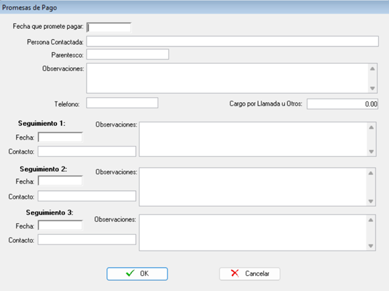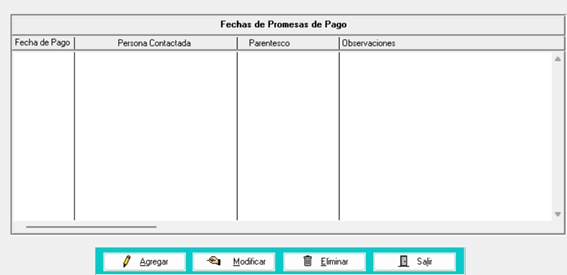 Si se necesita modificar una promesa de pago existente, en lugar de agregar, deberá presionar el botón “Modificar” en el cual se abrirán las mismas pantallas y debe cambiar los datos que considere.