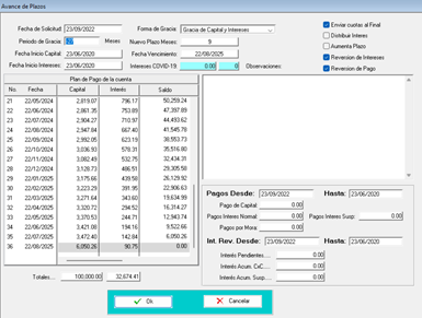 En este botón se utiliza para avanzar plazos en meses según el plan de pago. Al presionarlo, nos llevará a la siguiente pantalla: