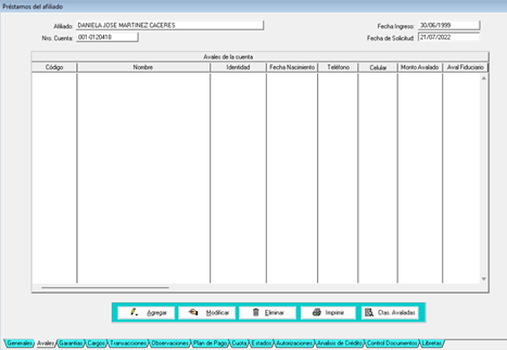 Diríjase a la página principal de préstamos del afiliado y, a continuación, haga clic en la opción "Avales" que se encuentra en las pestañas ubicadas en la parte inferior de la pantalla. Al hacerlo, se abrirá la interfaz que se muestra a continuación: