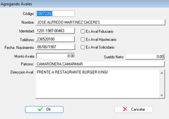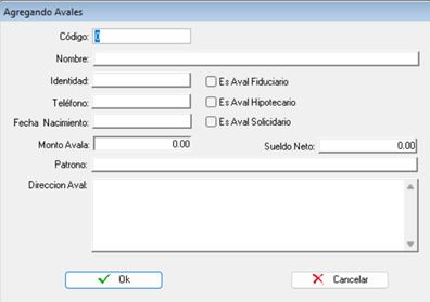 Es importante mencionar que el aval debe estar ingresado previamente en la base de datos del sistema.