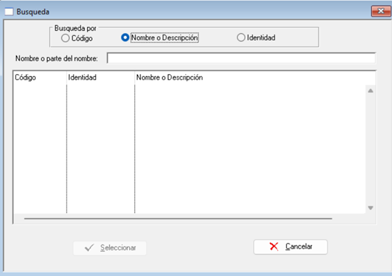 Aquí se podrá realizar la búsqueda del aval por nombre, código o número de identidad, seleccionando en las tres opciones de la parte superior. Al ingresar cualquiera de estos datos, deberá presionar de nuevo la tecla tab para visualizar todas las opciones disponibles con la información ingresada y seleccionar a la persona que busca.
