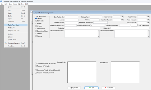 Al ingresar, deberá llenar toda la información solicitada en las casillas y para agregar la fotografía que se solicita en las últimas casillas, se deberá hacer clic en el botón de la esquina superior izquierda “Edit” y luego “Paste from file”, esta acción le llevará a visualizar las imágenes ya guardadas en el computador del oficial de atención, y es ahí donde deberá seleccionar la imagen correspondiente.