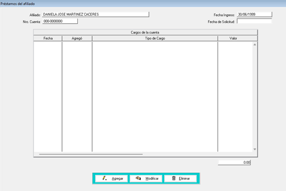 Diríjase a la página principal de préstamos del afiliado y, a continuación, haga clic en la opción “Cargos" que se encuentra en las pestañas ubicadas en la parte inferior de la pantalla. Al hacerlo, se abrirá la interfaz que se muestra a continuación: