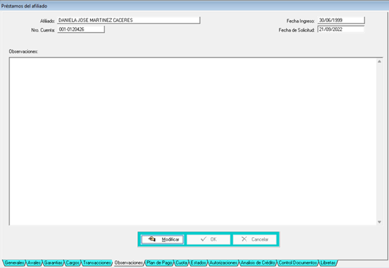 · Agregar observaciones: Para poder visualizar o modificar las observaciones de la cuenta, diríjase a la página principal de préstamos del afiliado y, a continuación, haga clic en la opción “Observaciones" que se encuentra en las pestañas ubicadas en la parte inferior de la pantalla. Al hacerlo, se abrirá la interfaz que se muestra a continuación: