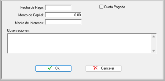 Seguidamente, deberá ingresar la fecha de pago, el monto de capital, el monto de los intereses, y de existir, las observaciones de esta cuenta; igualmente deberá seleccionar si esta cuota ha sido pagada, marcando la casilla de “Cuota pagada” de la parte derecha. Al finalizar, presionar sobre el botón “OK”.