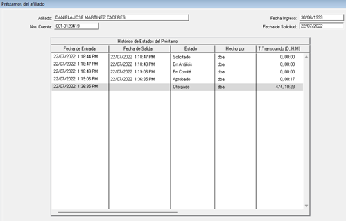 En esta pantalla se pueden observar todos los estados por los que ha pasado el préstamo. No se puede modificar ninguna información.
