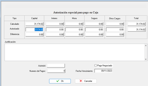 - Si se desea ingresar uno nuevo, debe agregar los nuevos cálculos en la casilla de “Autorizado”, luego ingresar una justificación en la celda de abajo, también seleccionar en la casilla si es un pago negociado, y, por último, agregar la fecha de vencimiento de esta autorización. Para guardarlo, presionar el botón “OK”.