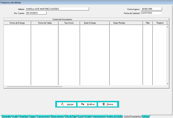 · Control de documentos: Para llevar un control de los documentos de una cuenta de préstamos, tanto los que el afiliado entrega, como los que la cooperativa le entrega al afiliado, diríjase a la página principal de préstamos del afiliado y, a continuación, haga clic en la opción “Control de documentos" que se encuentra en las pestañas ubicadas en la parte inferior de la pantalla. Al hacerlo, se abrirá la interfaz que se muestra a continuación: