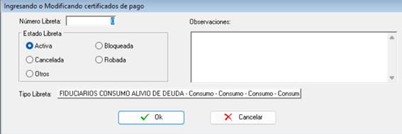 En número de libreta deberá ingresar el número asignado para esta, luego definir el estado actual de esta libreta seleccionándola entre las opciones brindadas y para finalizar agregar una observación en la casilla de la derecha. Se puede observar en la parte inferior que aparece automáticamente qué tipo de libreta es esta de acuerdo con la cuenta seleccionada. Para guardar, presione el botón “OK”.