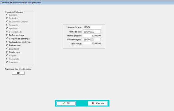 Cuando se defina el estado al que pasará el préstamo, se deberá seleccionar de las opciones del panel izquierdo y luego presionar sobre el botón “OK”.