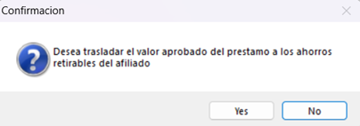 se deposita el valor del préstamo a la cuenta de ahorros retirables. Para poder hacerlo, el préstamo debe tener un estado “Aprobado”. Al presionarlo, el sistema presentará el siguiente mensaje: