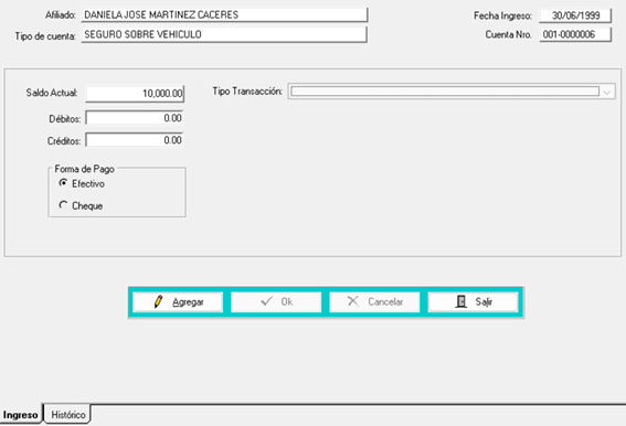 - En la pestaña de histórico podrá encontrar todas las transacciones realizadas en esta cuenta, mostrando los saldos, débitos, créditos, etc.