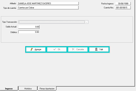 - En la pestaña de histórico podrá encontrar todas las transacciones realizadas en esta cuenta, mostrando los saldos, débitos, créditos, etc.