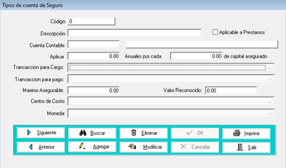 Seguidamente, deberá definir la cantidad a descontar anual por cada monto del capital asegurado, luego seleccionar de la lista desplegable las transacciones para cargo y para pago, también deberá definir el máximo asegurable y el valor reconocido, así como el centro de costo y la moneda; finalmente presionar el botón “Ok”.
