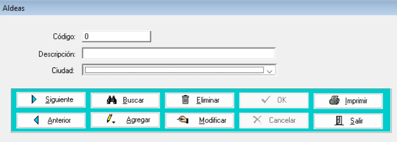- Para poder ingresar una nueva aldea deberá presionar sobre el botón “Agregar” y seguidamente en la casilla de descripción escribir el nombre de la aldea que desea registrar y, luego seleccionar de la lista desplegable la ciudad a la que pertenece. finalmente presionar el botón “Ok”.