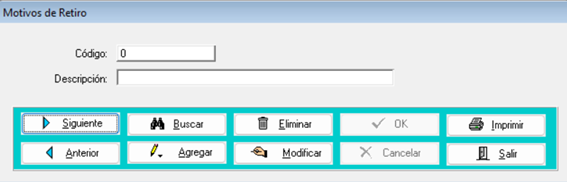 Para buscar y/o modificar un motivo de retiro, simplemente seleccione el botón ‘Buscar’ y/o navegue utilizando los botones ‘Anterior’ y ‘Siguiente’ hasta ubicarlo. Una vez encontrado, presione 'Modificar' para realizar los cambios necesarios. Por último, guarde los cambios presionando 'Ok'.