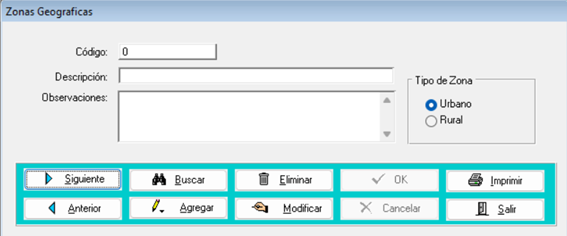 - Para buscar y/o modificar una zona geográfica, simplemente seleccione el botón ‘Buscar’ y/o navegue utilizando los botones ‘Anterior’ y ‘Siguiente’ hasta ubicarla. Una vez encontrada, presione 'Modificar' para realizar los cambios necesarios. Por último, guarde los cambios presionando 'Ok'.
