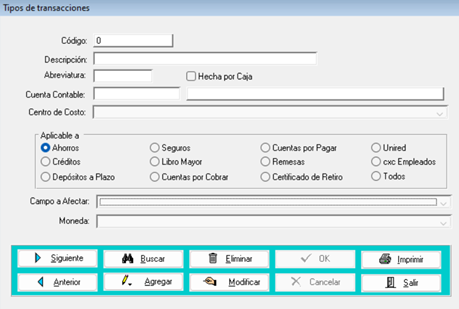 Seguidamente, deberá definir de la lista desplegable, el centro de costo, el campo a afectar y la moneda, así como marcar de las opciones disponibles, a qué será aplicable este tipo de transacción (Ahorros, créditos, depósitos, seguros, etc.); finalmente presionar el botón “Ok” para guardar.