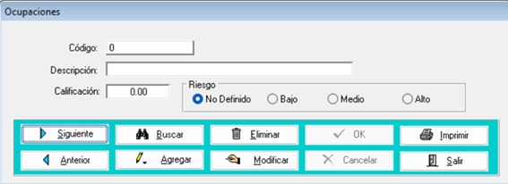 Para poder ingresar una nueva ocupación deberá presionar sobre el botón “Agregar” y seguidamente en la casilla de descripción escribir el nombre de la ocupación que desea registrar; La calificación se llena automáticamente dependiendo del riesgo que defina en los botones del lado derecho; finalmente presionar sobre el botón “OK” para guardar.