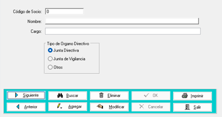 Para poder ingresar un nuevo dirigente en la base de datos del sistema, deberá presionar sobre el botón “Agregar” y seguidamente en la casilla de nombre, deberá presionar la tecla Tab, la cual le llevará a buscar al dirigente por código, nombre o descripción, al seleccionarlo, automáticamente la casilla de código será completada por el sistema, luego, deberá ingresar el cargo que ostenta este dirigente y luego seleccionar el tipo de órgano directivo al que pertenece de las opciones disponibles en pantalla; finalmente presionar sobre el botón “OK” para guardar.