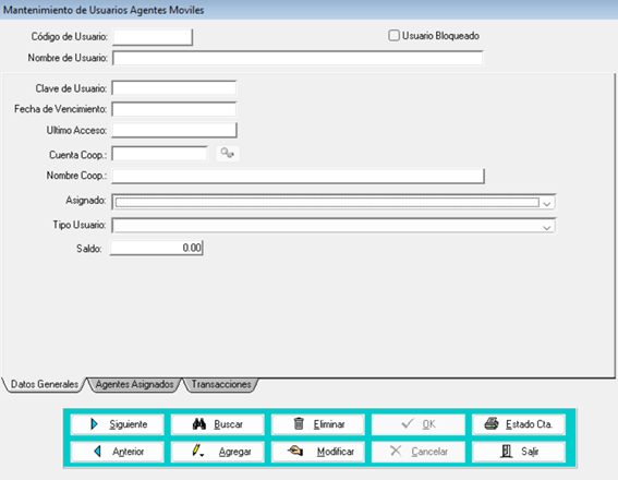 En esta pantalla podremos observar 3 pestañas: Datos generales, agentes asignados y transacciones. Las pestañas de agentes asignados y transacciones son solamente de visualización, por lo que no se podrán realizar modificaciones.