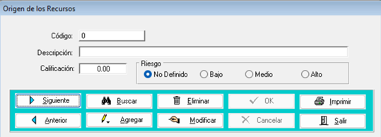 Para poder ingresar un nuevo origen de recursos en la base de datos del sistema, deberá presionar sobre el botón “Agregar” y seguidamente en la casilla de descripción escribir el nombre de esta, la calificación se llena automáticamente dependiendo del riesgo que usted defina en los botones del lado derecho; finalmente presionar sobre el botón “OK” para guardar.